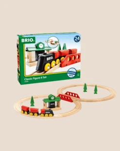 The 33028 Classic Figure 8 Set is a beautiful 22-piece wooden train set, full of tactile play features and inspired by classic Scandinavian design. Drive around the wooden tracks, across the crossing bridge and arrive at the wooden train station. Taking inspiration from our most classic BRIO toys, this train set stands out from the rest with bold but playful colours and design.
