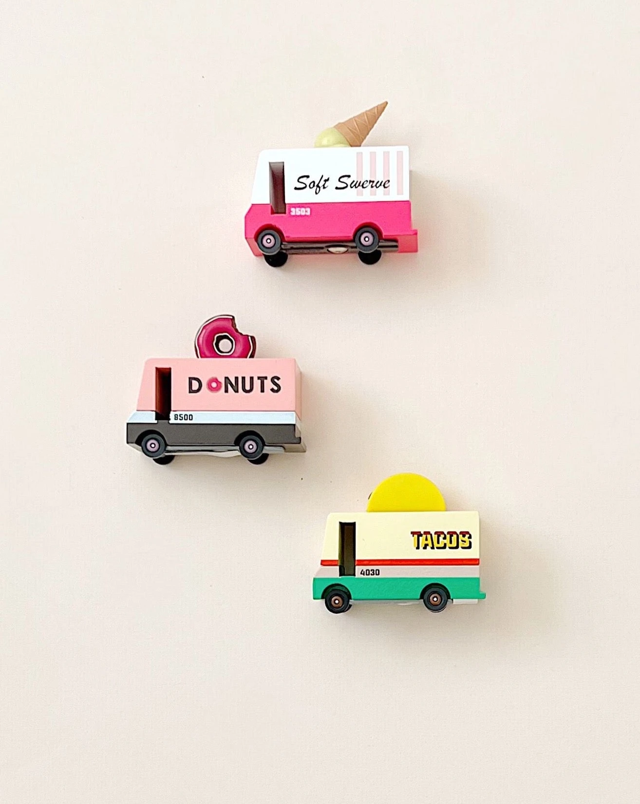 Each set includes a taco truck, donut truck and ice cream truck.