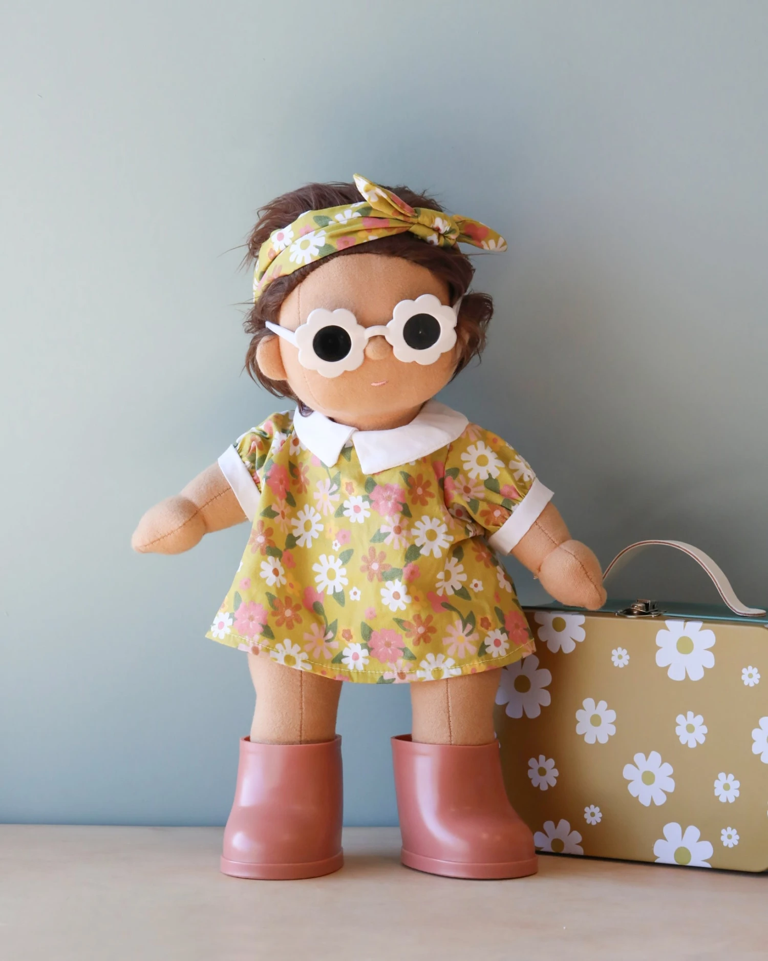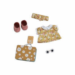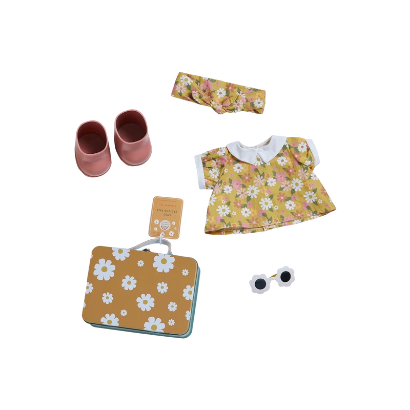 This doll comes with a removable unisex outfit, socks, nappy, and shoes. The additional metal suitcase includes a floral dress, matching headband, pink boots and fitted sunglasses.Â