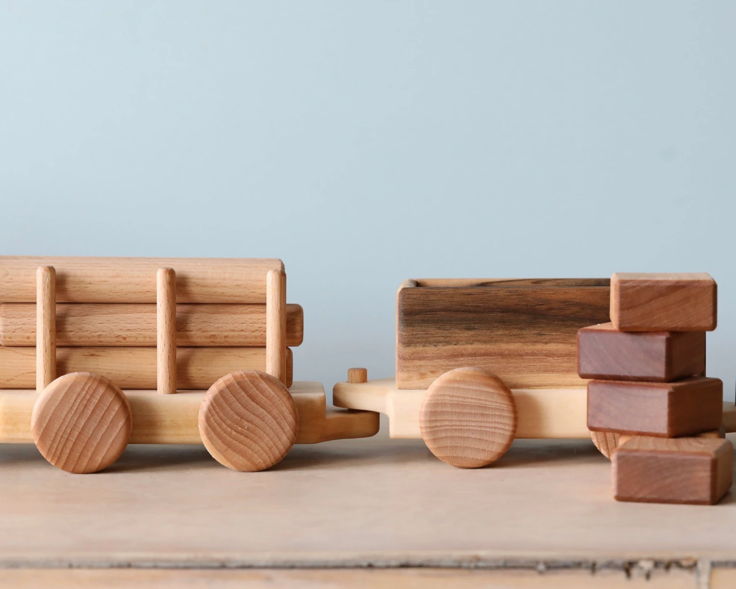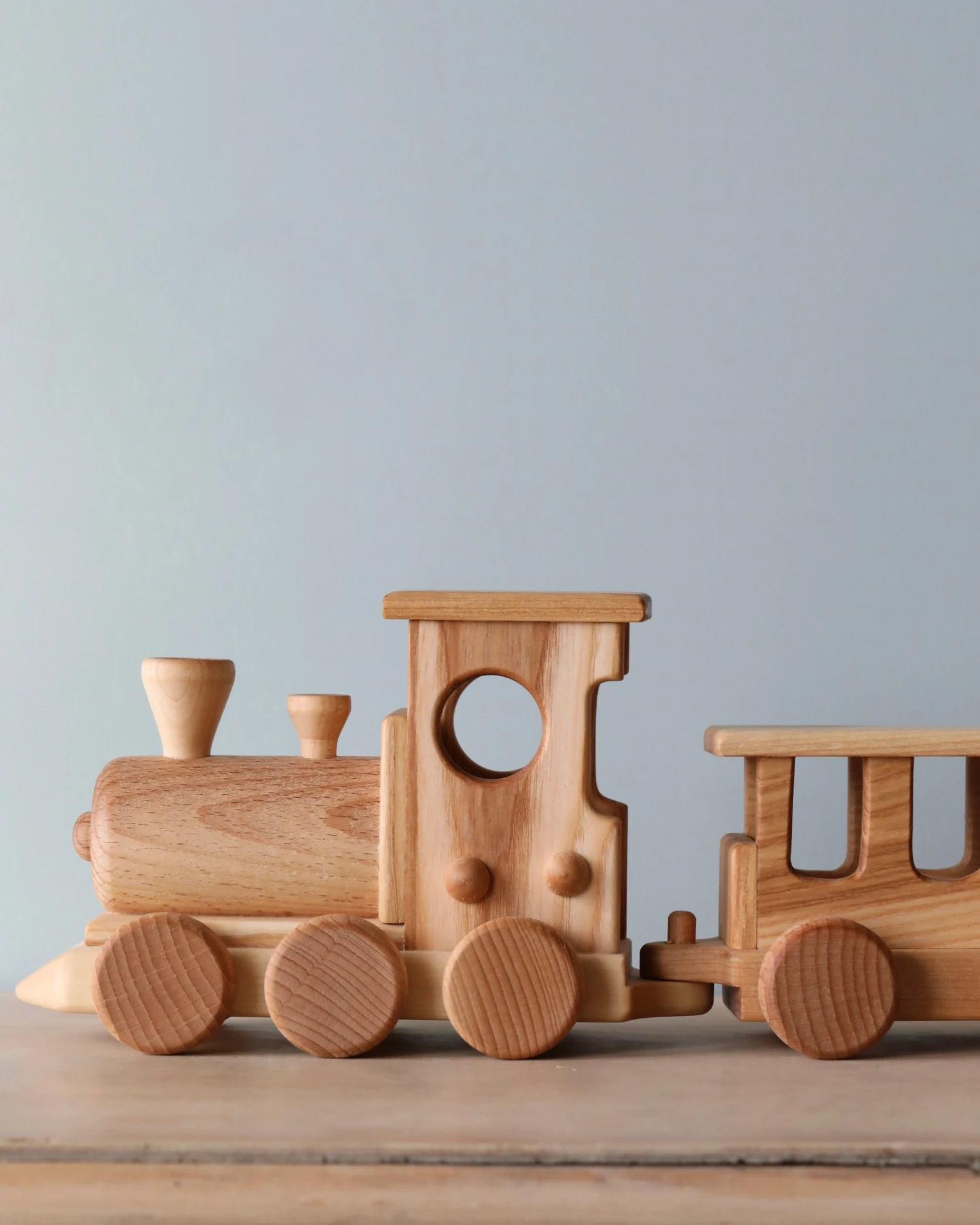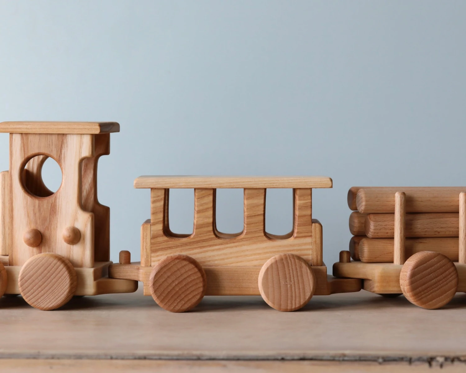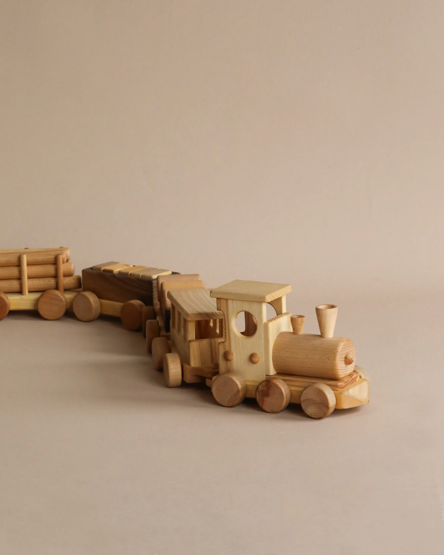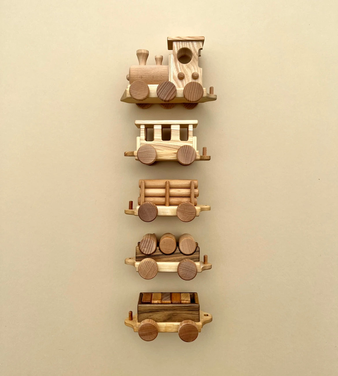 Handmade from beech wood, this set includes the locomotive, one passenger gar and three freight cars.Â