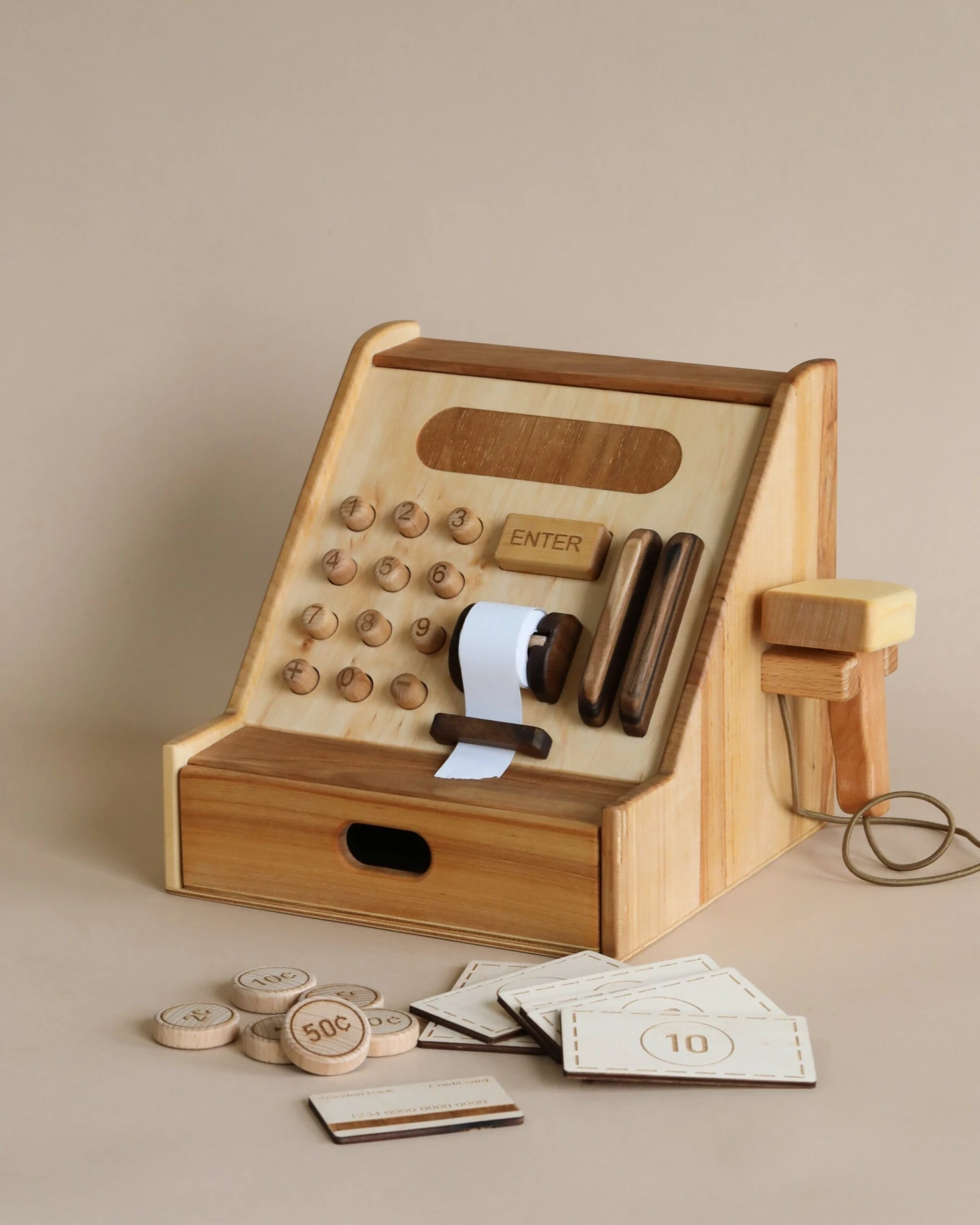 The wooden cash register is made from sustainably sourced wood. Designed with a drawer, buttons and a board with a card swipe. Comes with four lemon coins.