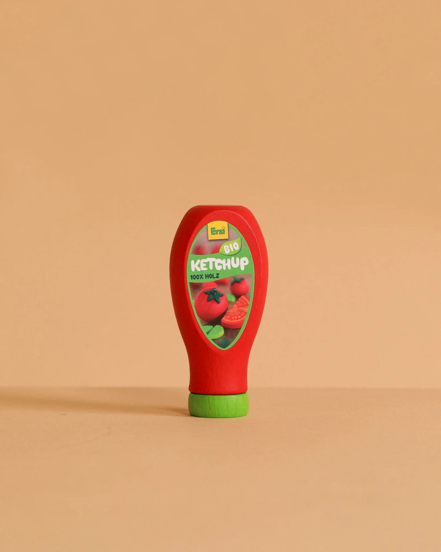 A realistic bottle of ketchup for store and kitchen play. Made of beech with non-toxic colors.