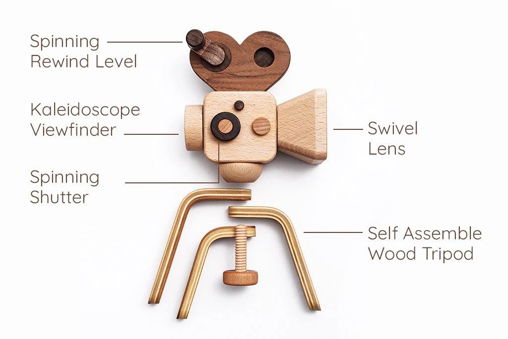 The build-in kaleidoscope viewfinder enhances creativity in children. The Super16 Wooden Toy Camera is designed to fit perfectly in a child’s hand, and it can be double as interior decor with the tripod.