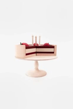 The set includes a stand, 6 pieces of cake, 6 candles, 6 strawberries halves. Each piece consists of a base and a side + three separate layers. They can be changed among themselves, so that the child can choose the order of the layers. This way, the child can make 3 different cakes.