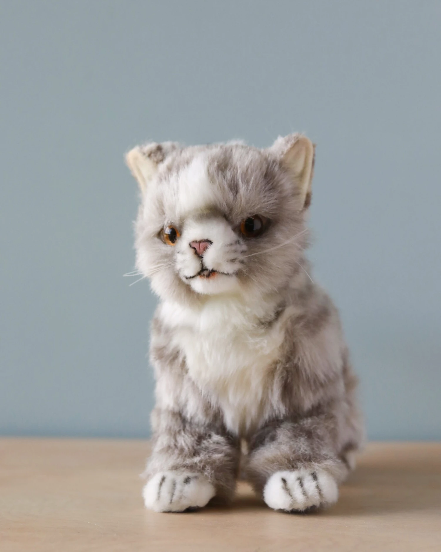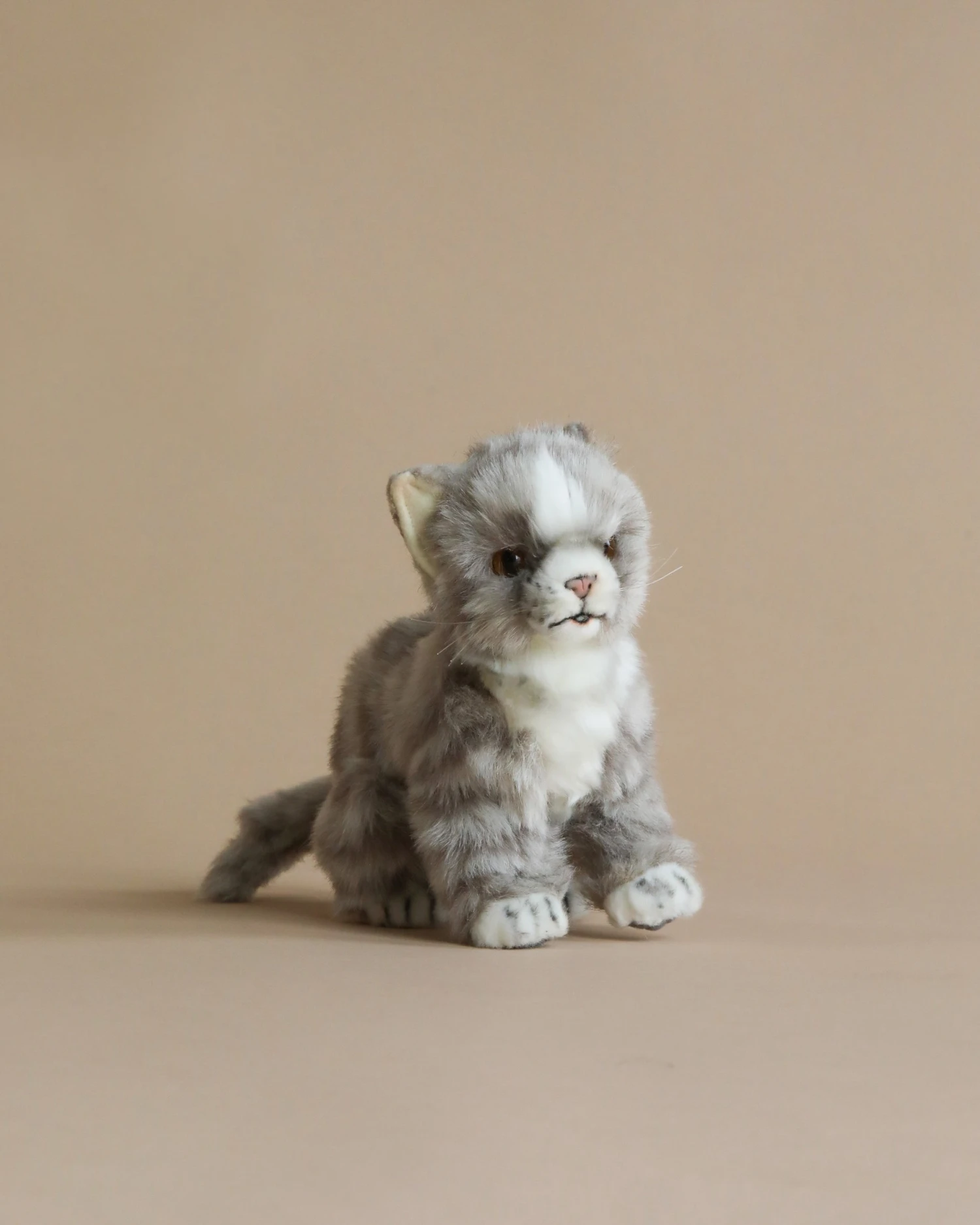 Artisan hand sew the animals “inside out”, an old world tradition that results in the mininization of seams, and their bodies are carefully “sculpted” to create “musculature” and “features” like movement in a walking or sitting position that are unique to each creature. On average, there are 42 separate pieces required to make each animal, that must be combined by a team of truly creative artists to create the distinctly realistic features that characterize HANSA animals. (Some animals have as many as 240 different parts!) Each animal is individually hand sewn, to give it a unique “personality”, there are more than 860 different fabrics and man-made furs from which the “coat” and “hides” are made, along with over 6000 sets of different eyes, whiskers, claws, noses, and related accessories allocated for creating these wonderful plush animals. Stuffing emphasizes careful attention to the placement of the highest quality man-made materials.