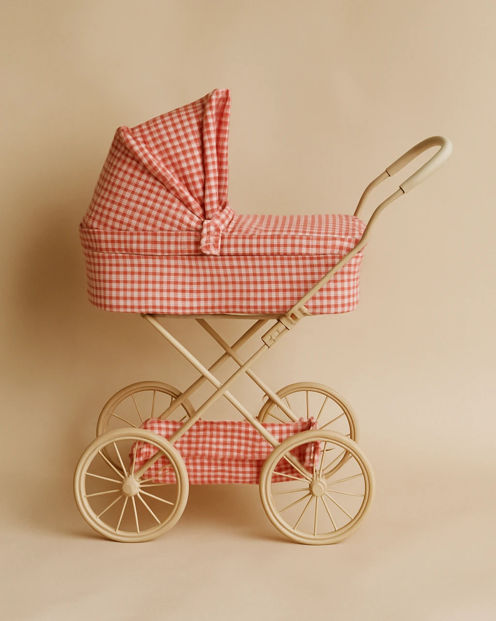 Vintage style doll pram designed with four large wheels. Features quilted fabric, delicate scallop edges, and a padded mattress. Designed with a softly cushioned storage basket under the lift. The frame is made of metal with spongy soft handles for easy grip.