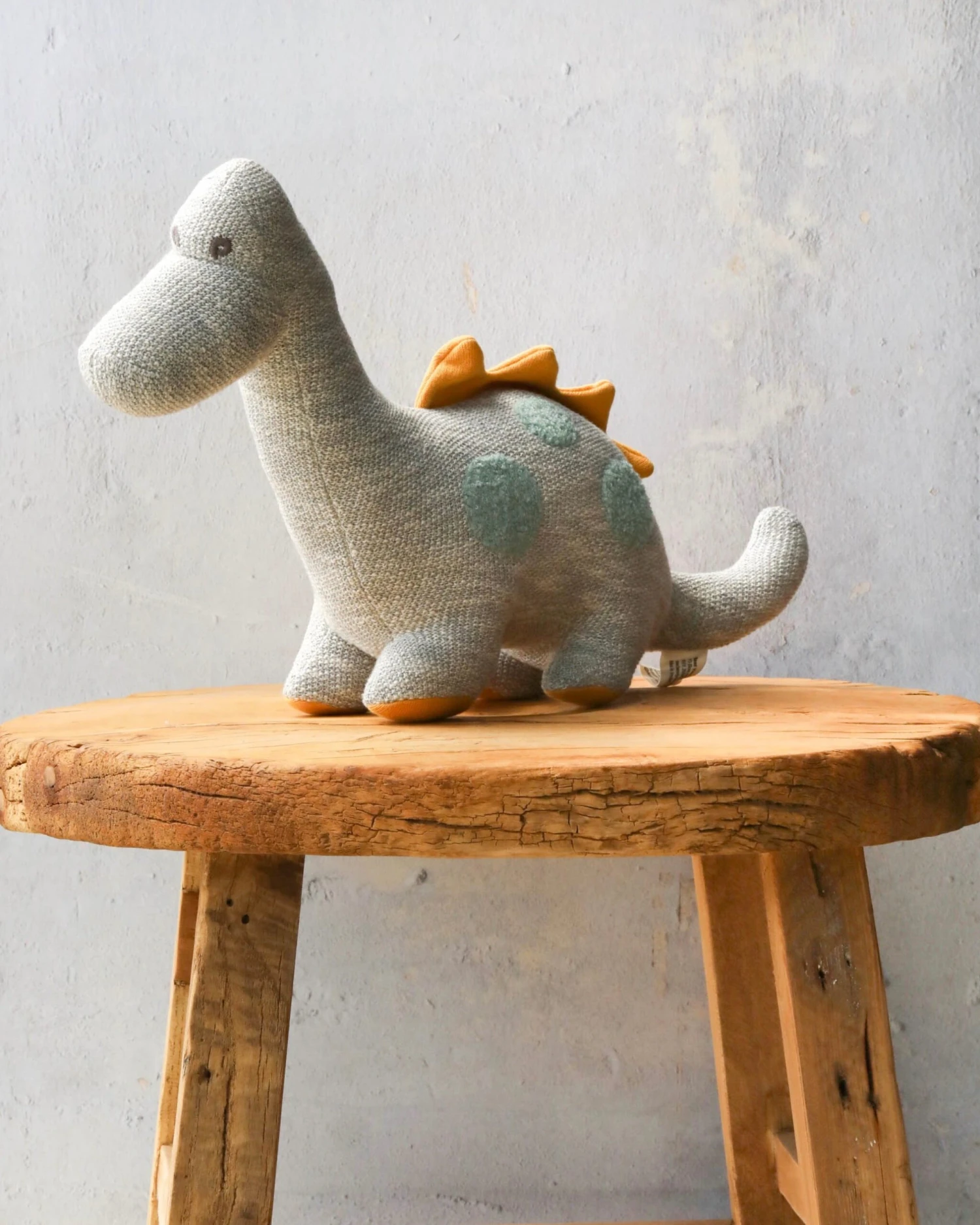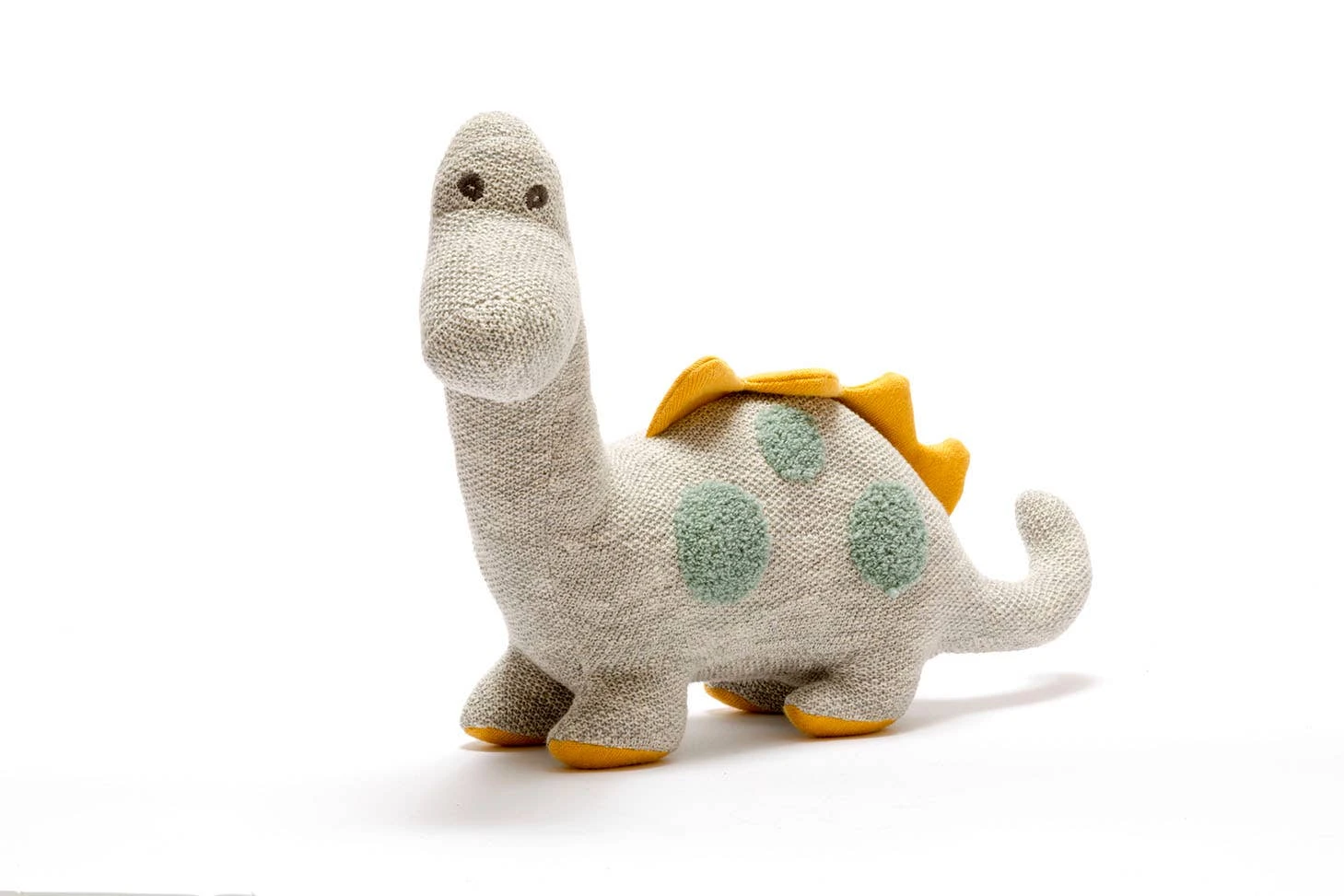 This knitted dinosaur toy is made from tactile organic cotton. Soft grey with raised teal spots and mustard spikes.