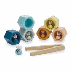 Children will become a little bit closer to nature and appreciate everything that bees do for us as they develop their fine motor skills by matching the bee to its hive using the pincer grasp or the forceps. Play reinforces color recognition and counting. This set includes six different bees and color matching hives plus one forcep. Sustainably made with reclaimed rubberwood and water based dyes.