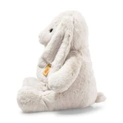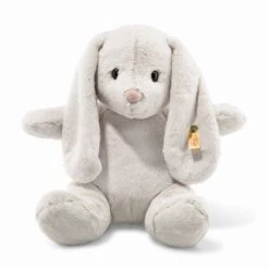 Say hello to the adorable Hoppie Rabbit! They’re right at home in an Easter basket or a gift bag for birthdays and other special occasions. Our light gray, soft rabbit playmate has a pastel pink nose and extra-long floppy ears. Perfect for cuddling and everyday play, small beanbags in Hoppie’s bottom, paws and soles allow them to sit up on a shelf in a nursery or at a table with other plush toys. The signature Steiff “Button in ear” symbolizes the finest standards of artistic quality and safety that went into the craftmanship of our lop-eared bunny plush. Hoppie comes in several sizes and other styles, such as different plush color options or bunny baby gifts like a rattle ring, security blanket or musical pull toy.