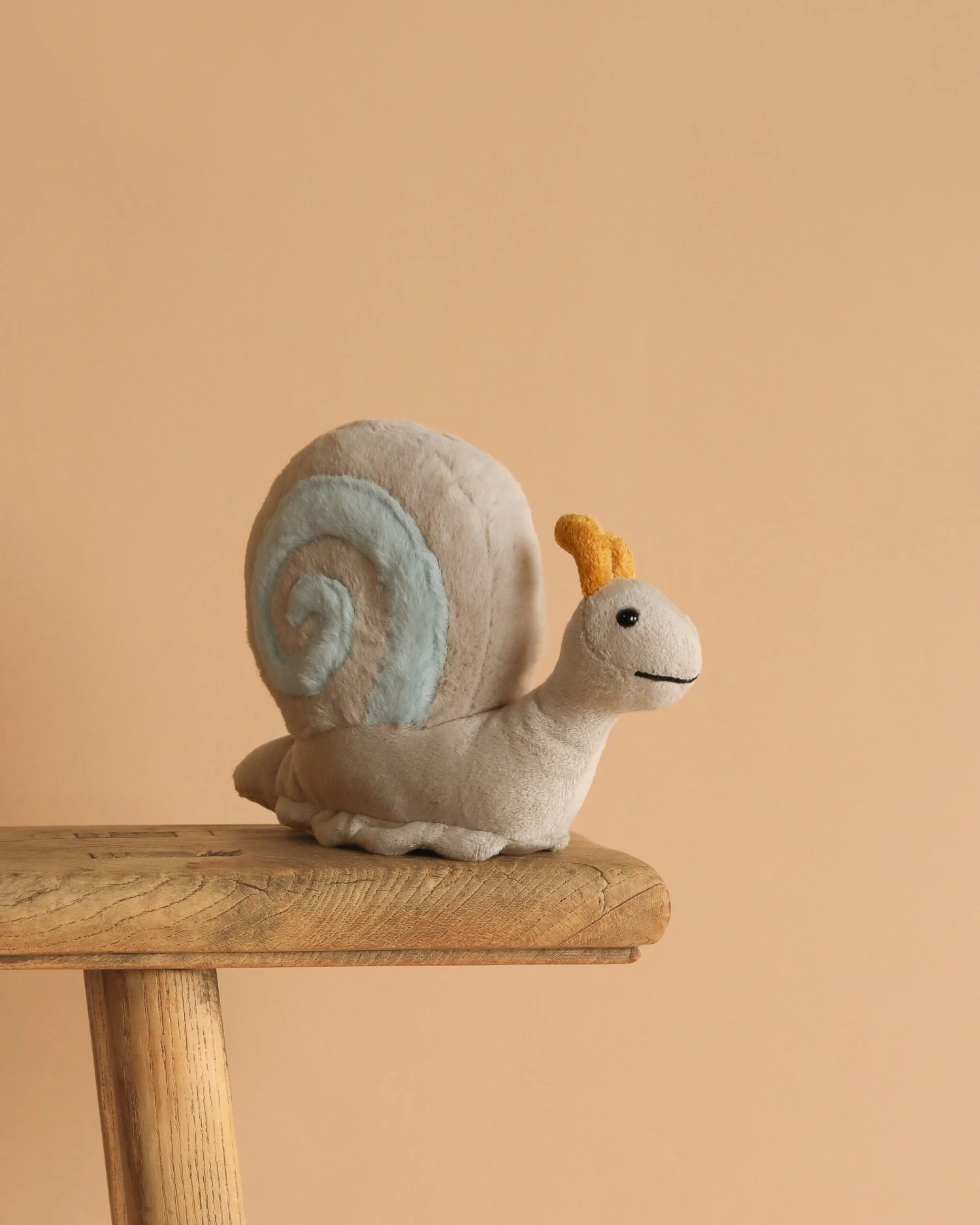 He may move slowly, but our Snaily slug will quickly become a playtime favorite. With his soft fabrics, and his gentle colors, he’s a soothing friend who’ll provide companionship and comfort. Beautifully made, and delightfully designed, he’s a unique choice to add to your child’s plush menagerie.
